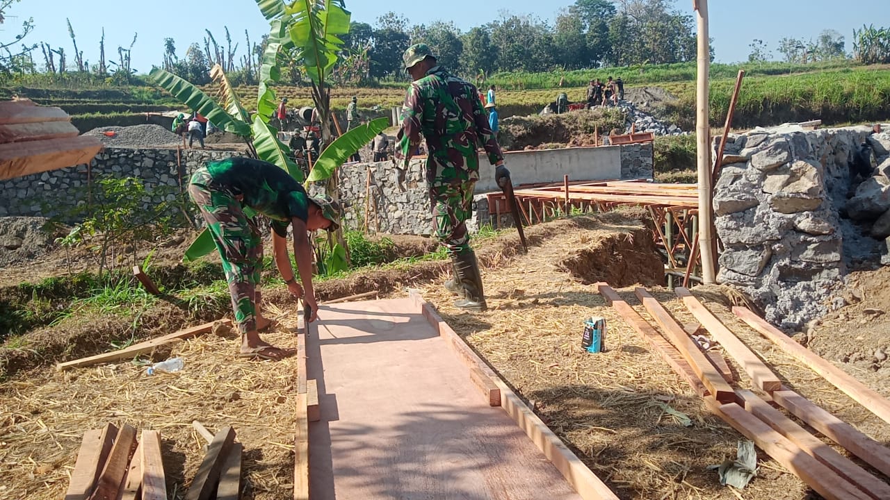 Satgas TNI Manunggal Membangun Desa (TMMD) Reguler Ke-117 Kodim 0727/Karanganyar di Desa Gentungan bersama warga mulai melakukan pemasangan papan untuk pengecoran jembatan.