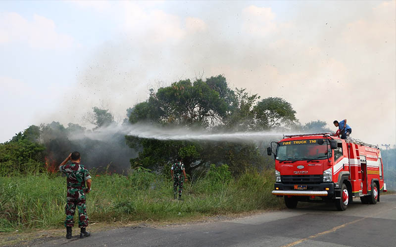 Lahan Ilalang Terbakar, Prajurit Lanud BNY Sigap Padamkan Api di Jalan Lintas Timur Sumatera