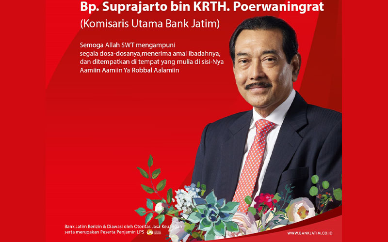 ”Innalillahi wainnailaihiraji’un. Keluarga besar bankjatim turut berduka cita yang sedalam-dalamnya atas berpulangnya bapak Suprajarto. Kami mendoakan semoga almarhum diberikan tempat terbaik di sisi Allah Swt. dan keluarga diberikan ketabahan serta kekuatan. Kami ucapkan terima kasih yang sebesar-besarnya atas dedikasi almarhum bapak Supra terhadap perkembangan bisnis bankjatim. Mohon dimaafkan segala kesalahan almarhum,” kata Direktur Utama bankjatim Busrul Iman.