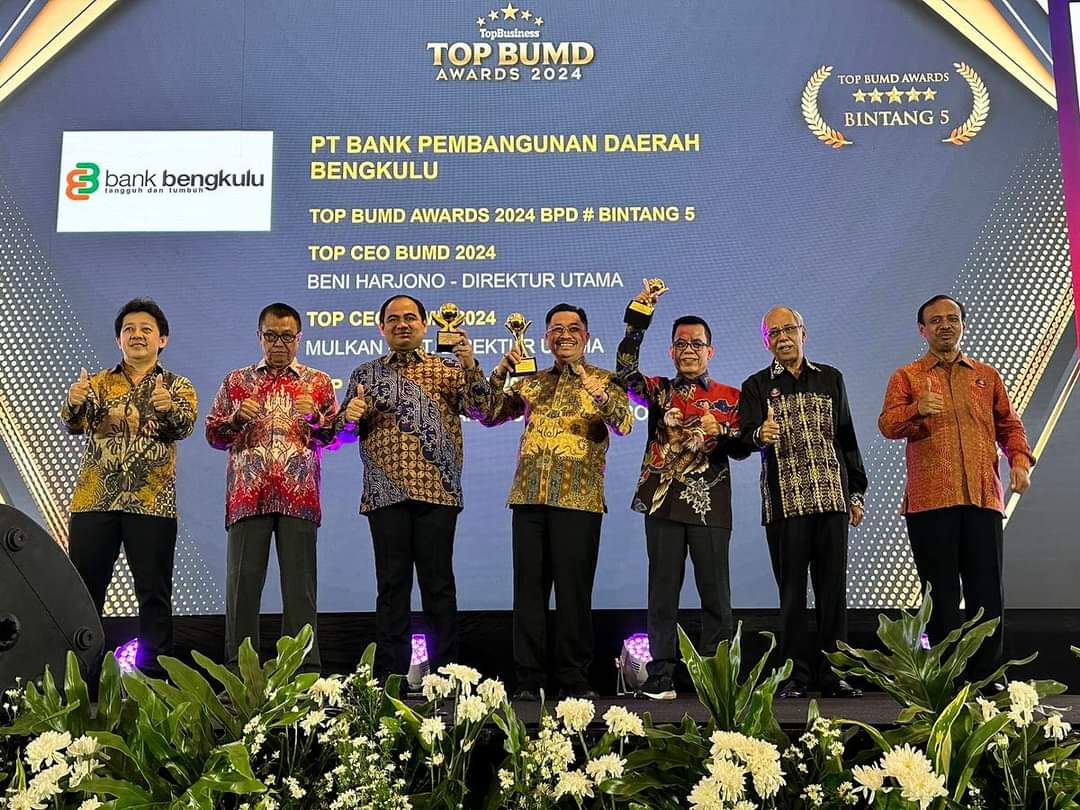 PT. Bank Pembangunan Daerah Bengkulu, raih TOP BUMD BPD Bintang5, Mulkan sebagai Plt Direktur Utama Bank Bengkulu sebagai TOP CEO BUMD 2024. Gubernur Bengkulu DR. H. Rohidin Mersyah sebagai TOP Pembina BUMD.
